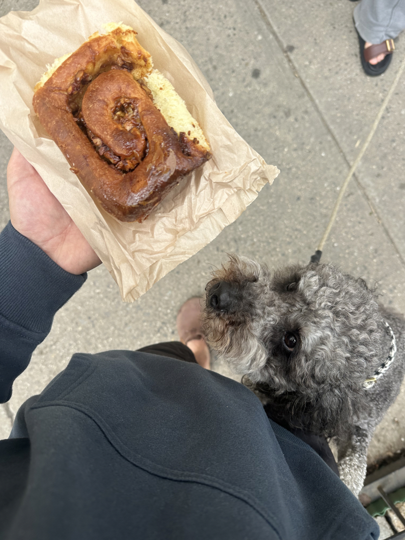 "This guy ahead of me was the coolest person I’ve ever seen. I am so not cool enough for LES or EV or wherever this is. That will change one day but he helped the barista (is that how you spell it) pick out a record and had cool diamonds on his teeth and I was like wow you’re cool. Well that was the only cool thing about this place because I walked 30 mins to try the best sandwich in the city and THEY HAD A FIRE THING AND THE OVENS WERE DOWN FOR THE WEEK 😭 so I got this pity pastry and decent coffee. I hope my score catapults when I go back and get the sandwich KP got that looked truly amazing. I didn’t like this pastry even though they said they’re famous for it. Tasted kinda burnt and not yummy. Probably would’ve liked the almost croissant more. Definitely would have liked a yummy sandwich more 😪 Coffee was actually pretty decent tho. The Kouign-amann is pronounced queen a-mahn in case you want to order something not very yummy" - Connor